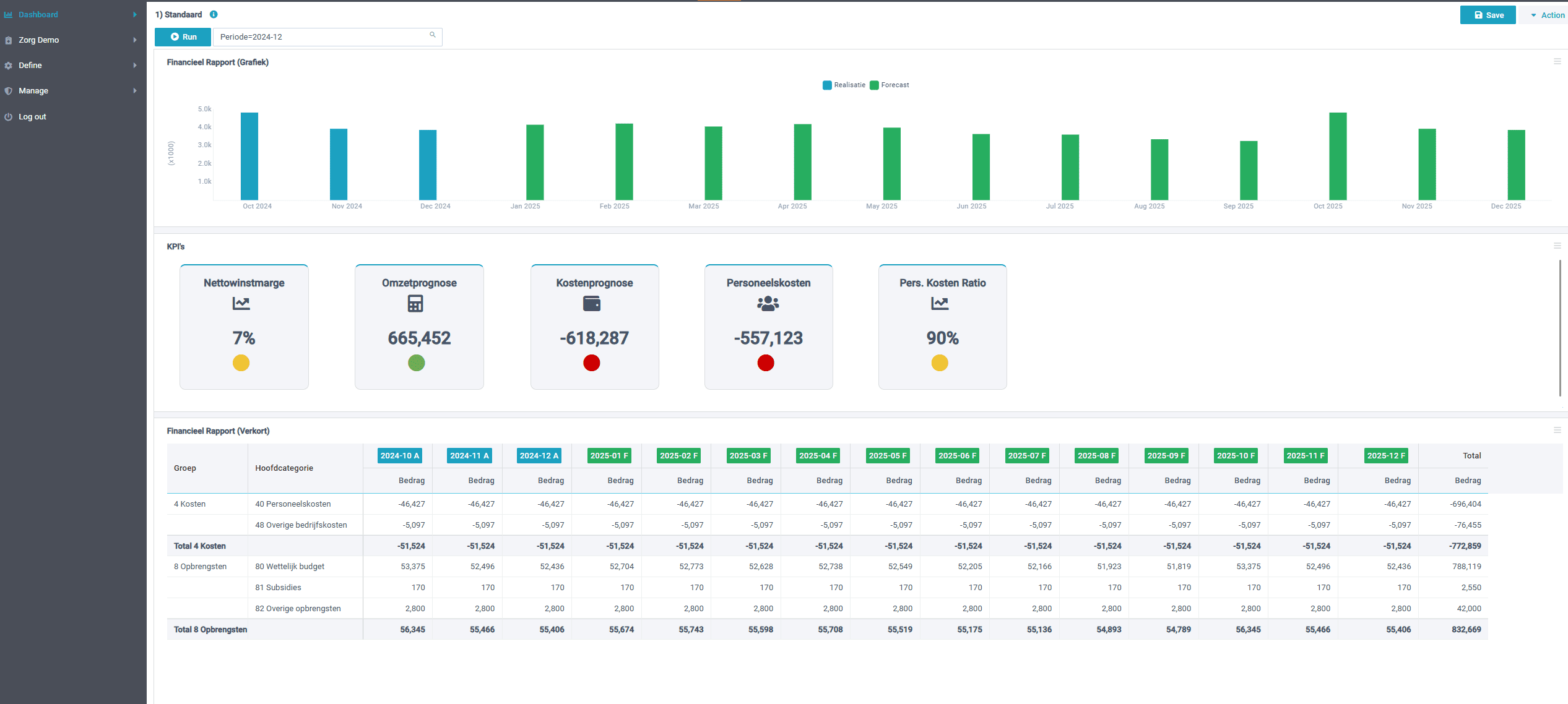 Het platform is ontworpen om flexibel, transparant en eenvoudig te koppelen te zijn. Daardoor kun je gegevens uit uiteenlopende bronsystemen – zoals financiële administratie, zorgproductie en HR – samenbrengen in één omgeving. Vervolgens kunnen gebruikers zelf rapportages of forecasts aanmaken, zonder afhankelijk te zijn van IT.