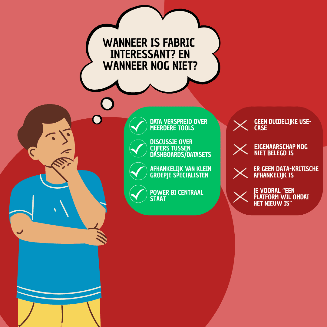 Onze insteek: Fabric is geen doel op zich. Het is waardevol als het aantoonbaar complexiteit wegneemt en adoptie versnelt.